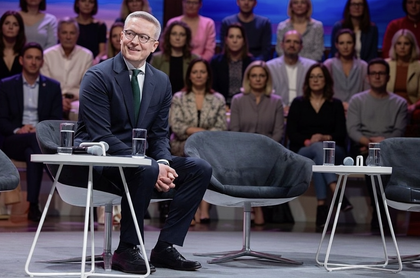 Teaser-Bild Karsten Wildberger im Studio von „Börse vor acht“, mit ernstem Blick, während Moderatorin Anja Reschke irritiert auf ihren Bildschirm schaut.
